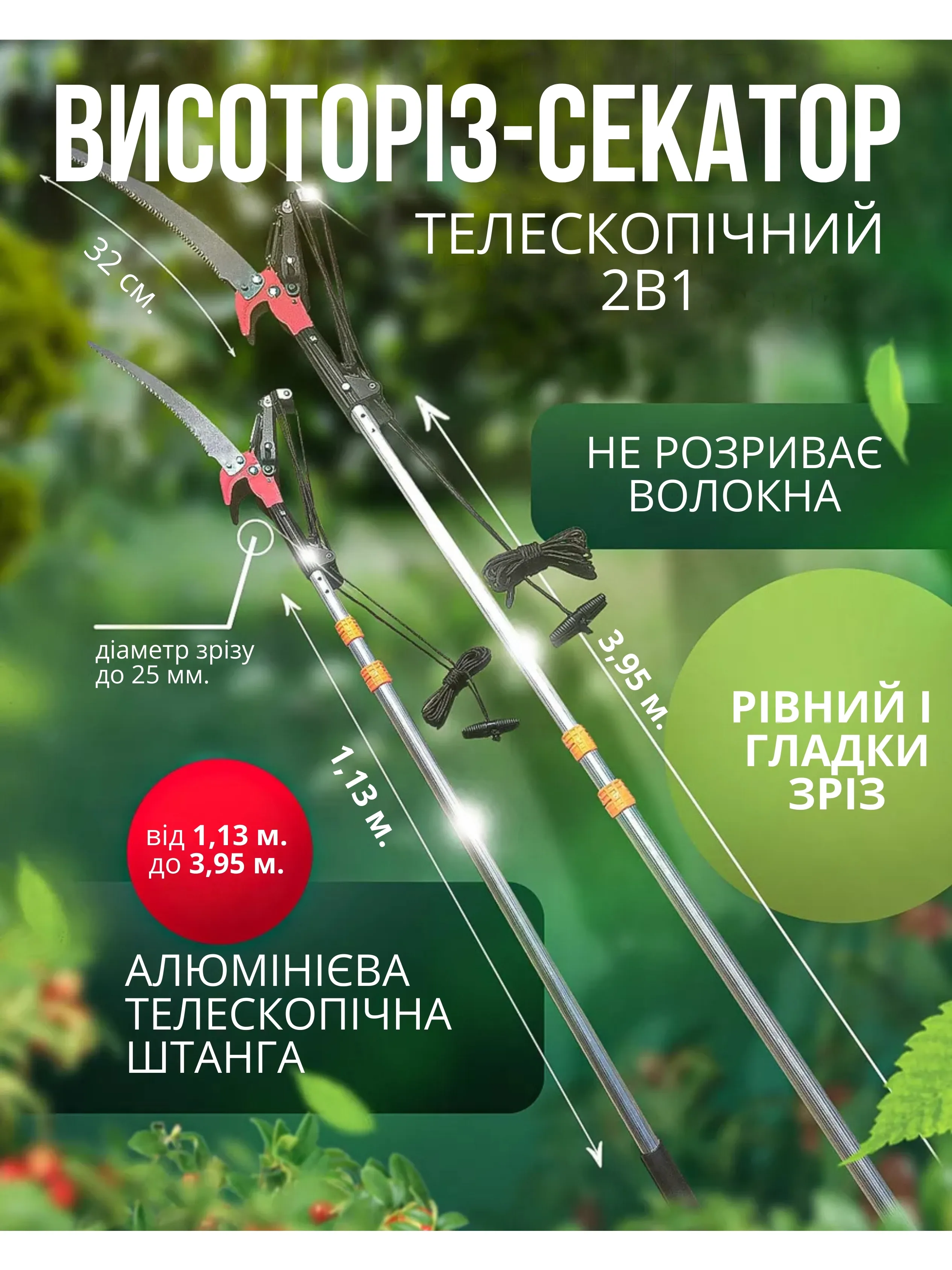 Висоторіз-секатор телескопічний 2в1 - це незамінний інструмент для садівників, який призначений для обрізання гілок на деревах які розташовані дуже високо. Завдяки своїй конструкції, він забезпечує зручну та безпечну роботу без необхідності використання драбини.