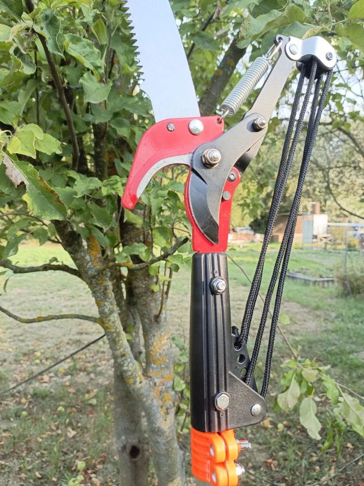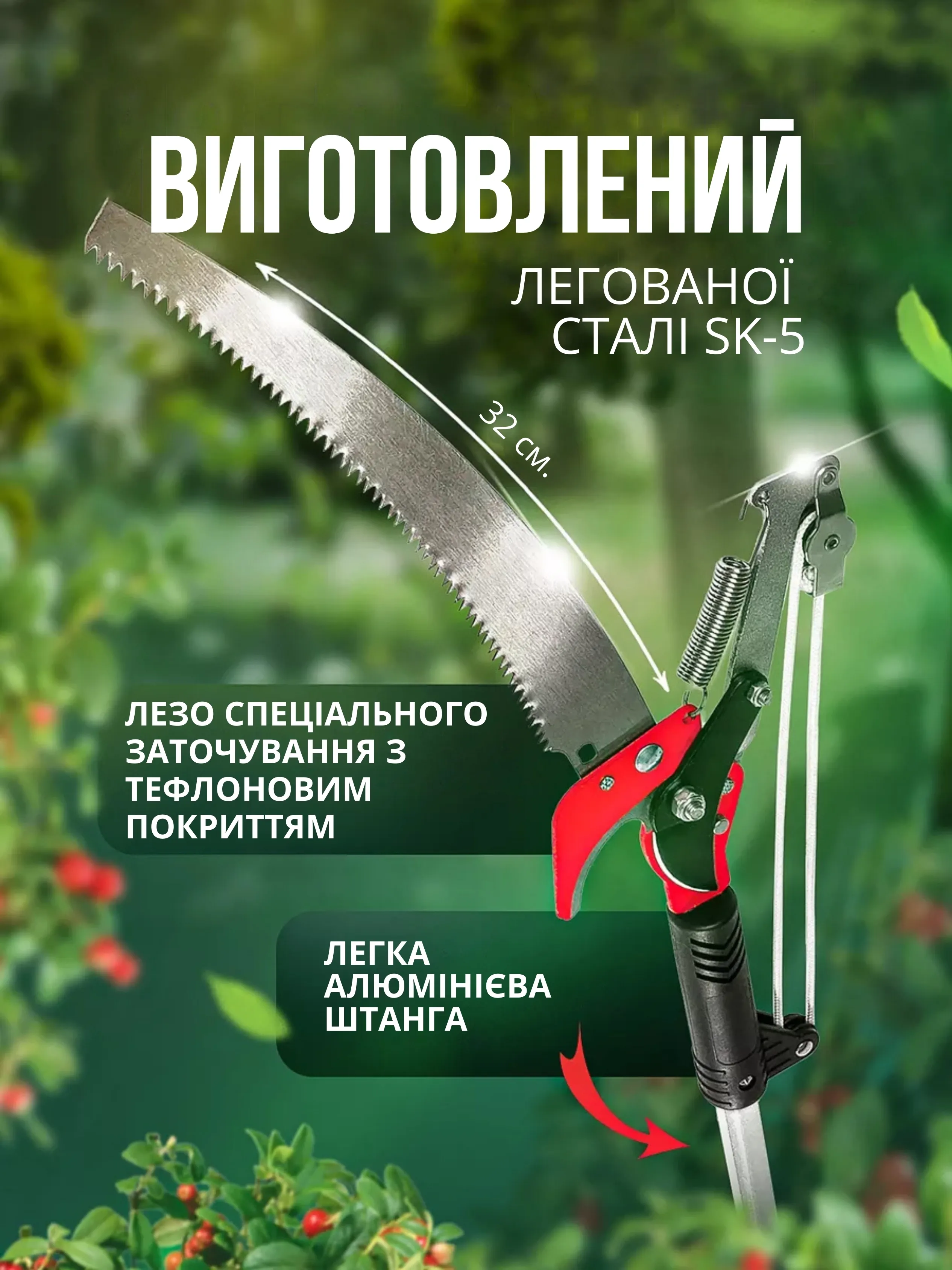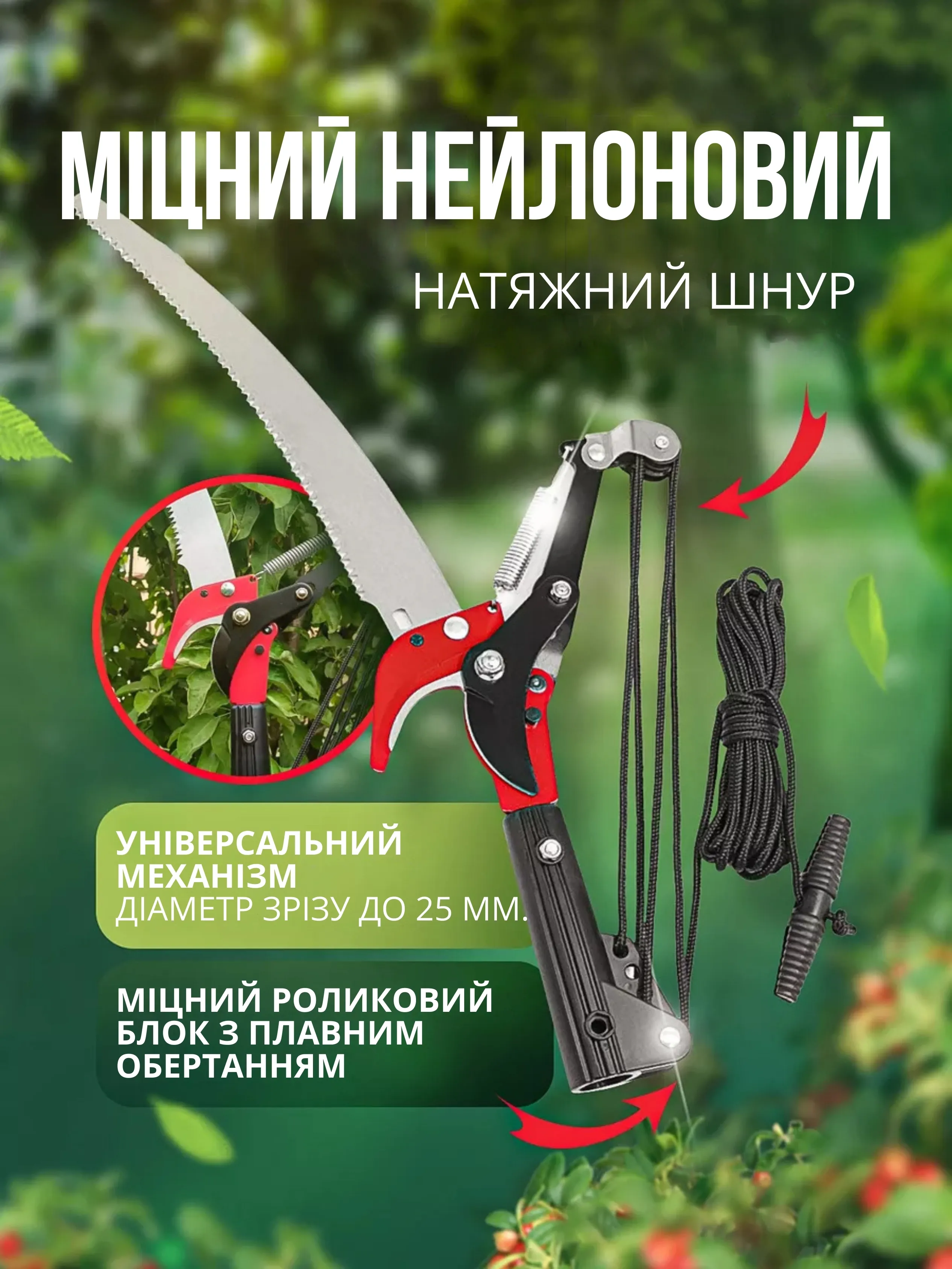 Зріз здійснюється за рахунок натягування міцного шнура, що робить управління інструментом інтуїтивно зрозумілим та легким. Можна обрізати гілки на висоті 5 м. і вище.