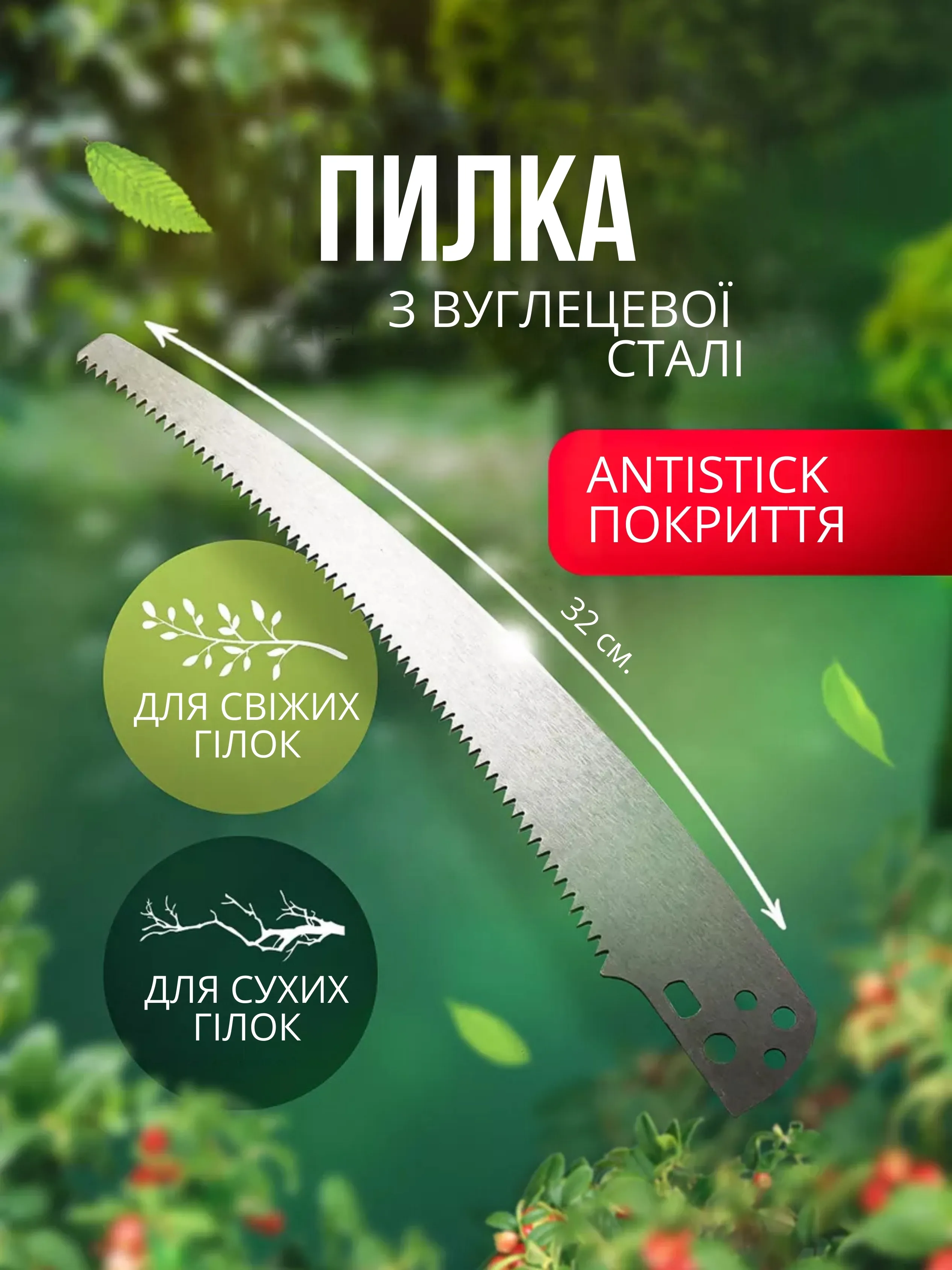 Вигнуте лезо виготовлене з високоякісної вуглецевої сталі (SK5), гостро заточене та дозволяє обрізати гілки діаметром до 25 мм. Гостро заточені зубчики забезпечує швидкий та чистий зріз.